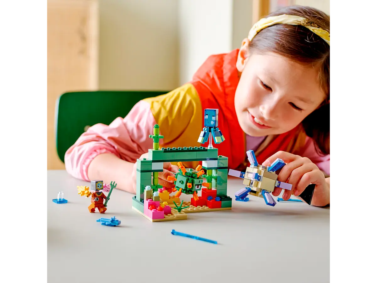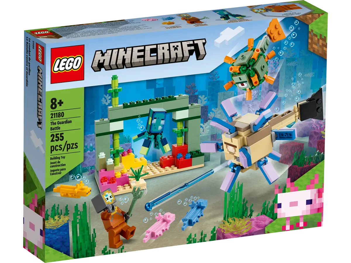 - Underwater adventure – LEGO® Minecraft® The Guardian Battle (21180) takes players on a creative ocean-floor mission filled with characters and features from the best-selling game