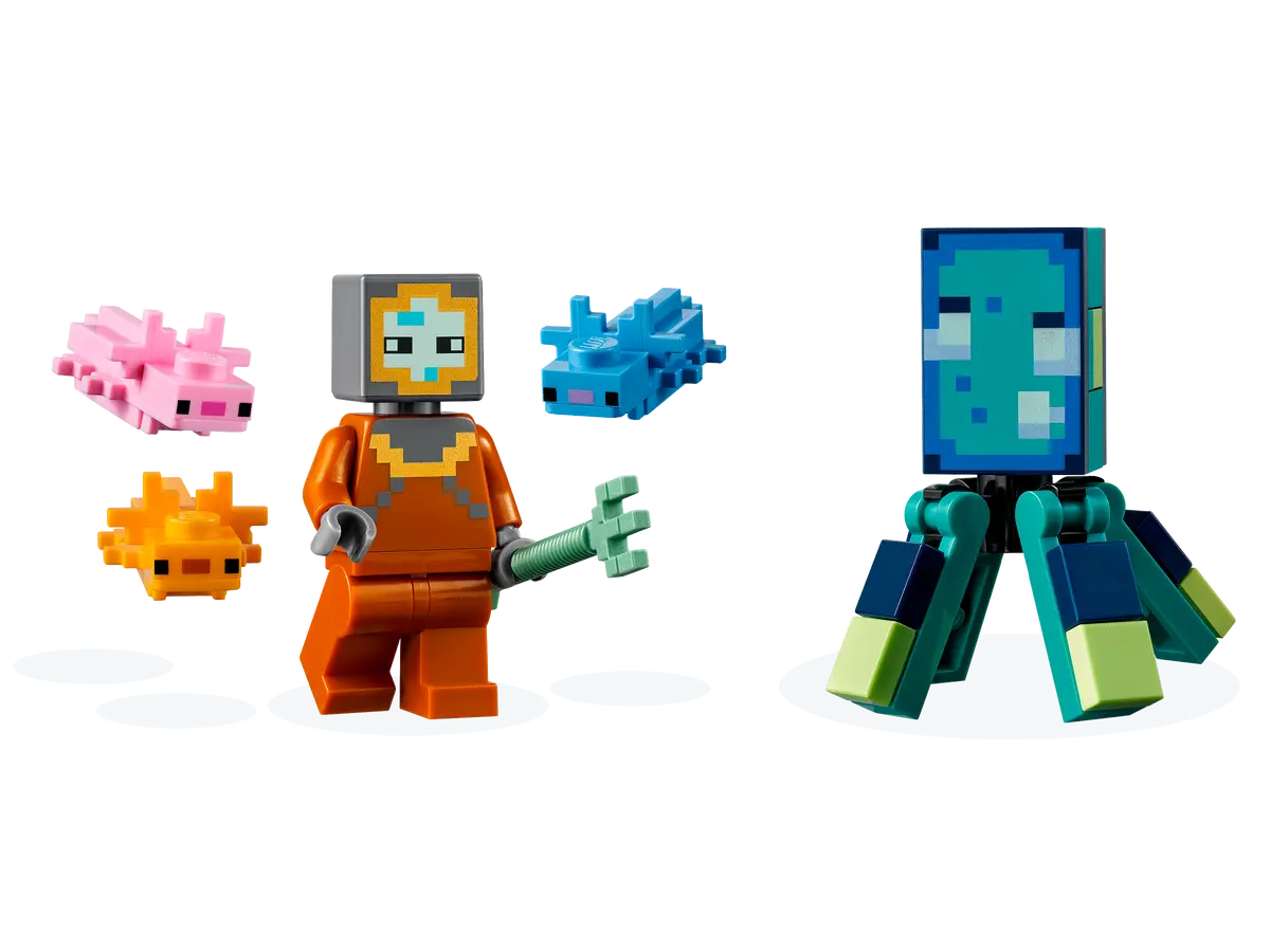 - Authentic action – The buildable coral reef and monument structure also feature iconic Minecraft® characters: a diver, glow squid, guardian, elder guardian and 3 axolotls
