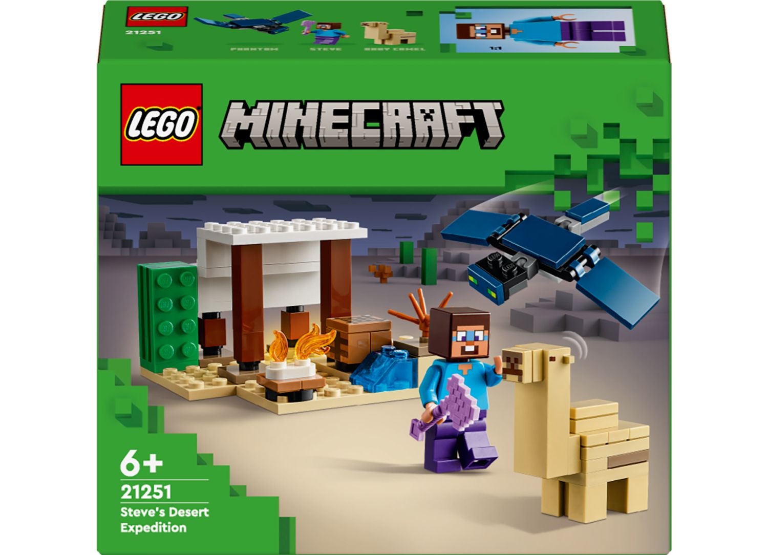 This LEGO® Minecraft® toy for players aged 6+ is the first building toy for kids located in the Minecraft desert biome. Steve's Desert Expedition (21251) challenges kids to build a Minecraft house in a hostile environment, then defend it against attack from the flying Phantom. This reconfigurable role-play gift for boys and girls 6 years old and up features 3 LEGO Minecraft figures, including Steve, plus a Minecraft hut in the desert biome. The set includes iconic Minecraft elements, such as acrafting table, campfire and various pieces of desert scenery. A great gift for any fan of Minecraft, the set inspires creative adventures and battle action when a flying Phantom with movable wings swoops down to attack the base. The toy also features an updated facial expression for Steve and the first appearance of a Baby Camel in a LEGO Minecraft set. This gift idea for kids and gamers is compatible with other LEGO Minecraft playsets (sold separately).