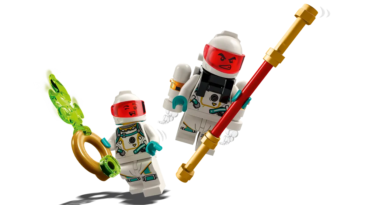 - 6 LEGO® minifigures – Monkie Kid, Mei, Sandy and Mr. Tang in space outfits and Shadow Monkeys Rumble and Savage, plus a Robot Mo figure and lots of toy weapons and accessories