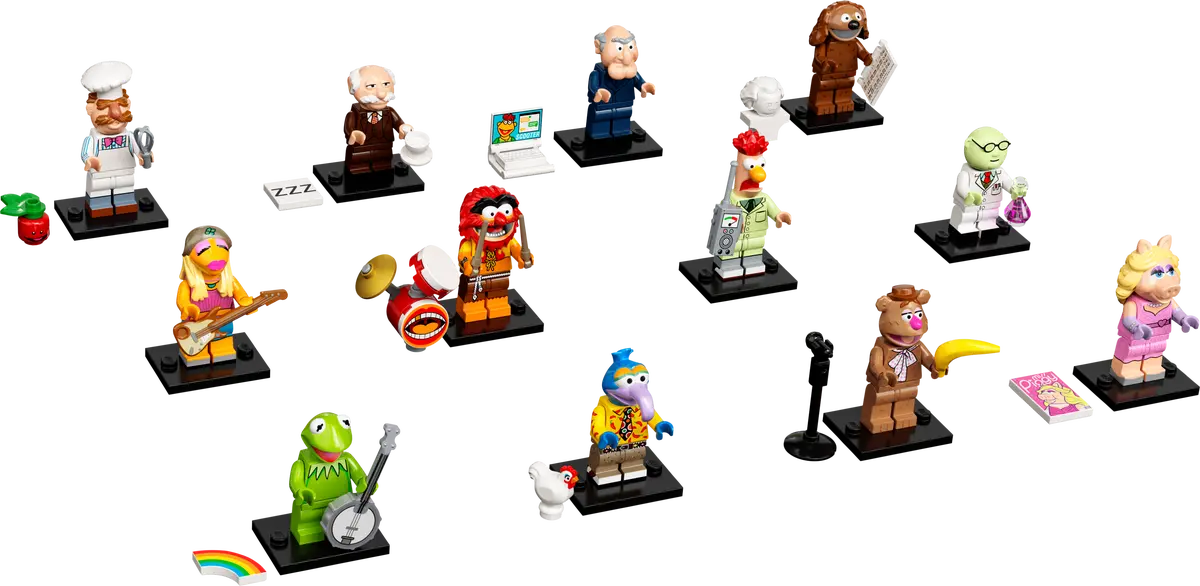 - متعة التجميع في حقيبة – 1 من 12 شخصية قابلة للبناء من شخصيات ديزني The Muppets لاكتشافها، بالإضافة إلى ملحق واحد أو أكثر ومنشور لهواة التجميع. إضافة ممتعة لأي مجموعة