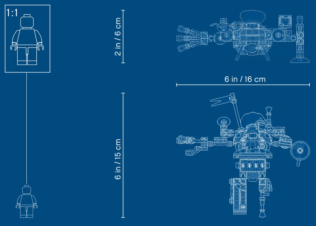 - يبلغ مقاس لعبة الروبوت الآلي One-Man-Metal-Band أكثر من 5 بوصات (15 سم) ارتفاعًا، و5 بوصات (15 سم) طولًا، و2 بوصة (7 سم) عرضًا.