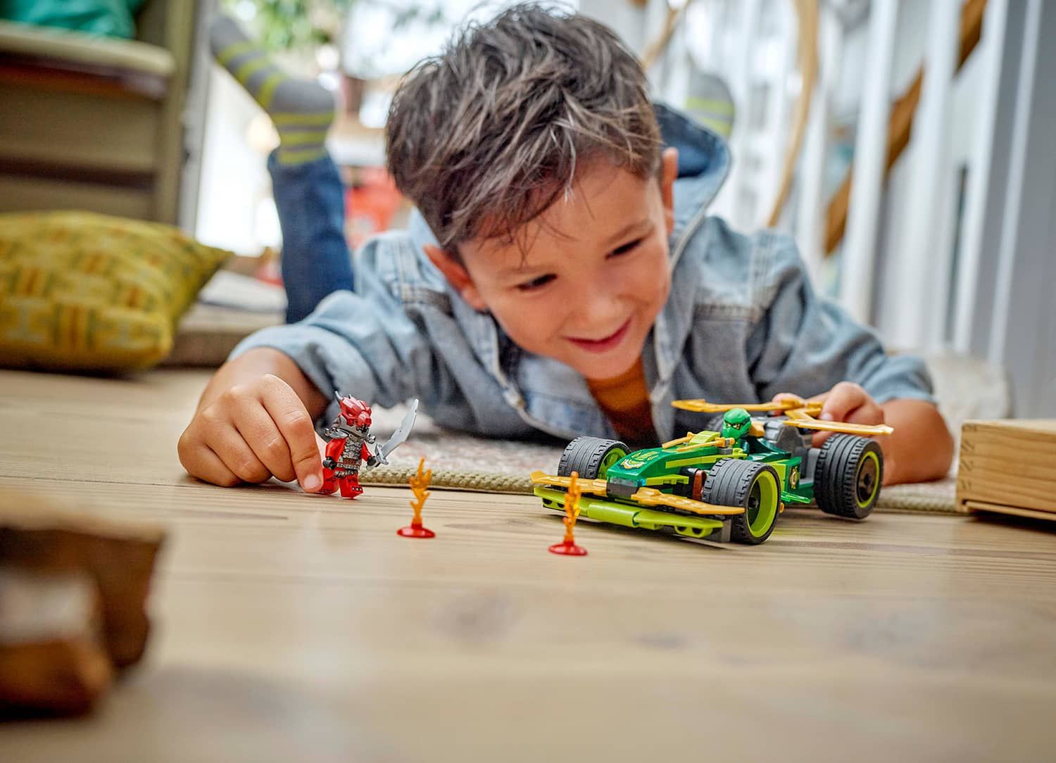 Delight your little ninja with the first-ever NINJAGO® pull-back race car toy! Boys and girls aged 7 and up can recreate superfast action from season 3 of the NINJAGO Dragons Rising TV show with Lloyd’s Pull-Back Race Car (71828) by pulling it back, releasing it and watching it speed forward. The sleek race car has 4 tires, a cockpit for a minifigure and is decorated with green lightning blades. The pretend play building kit comes with 2 NINJAGO minifigures: Lloyd with 2 golden katana sword accessories, and a villainous Dragonian Warrior with a sword accessory for kids to role-play exciting battles. The building set also includes 2 lighting elements to create a small obstacle course for the race car. The rest of the LEGO® NINJAGO range of buildable ninja toys for kids includes mechs, dragons and temples so fans can role-play action with their ninja heroes (sets sold separately). Each amazing ninja playset can also be created with the LEGO Builder app.