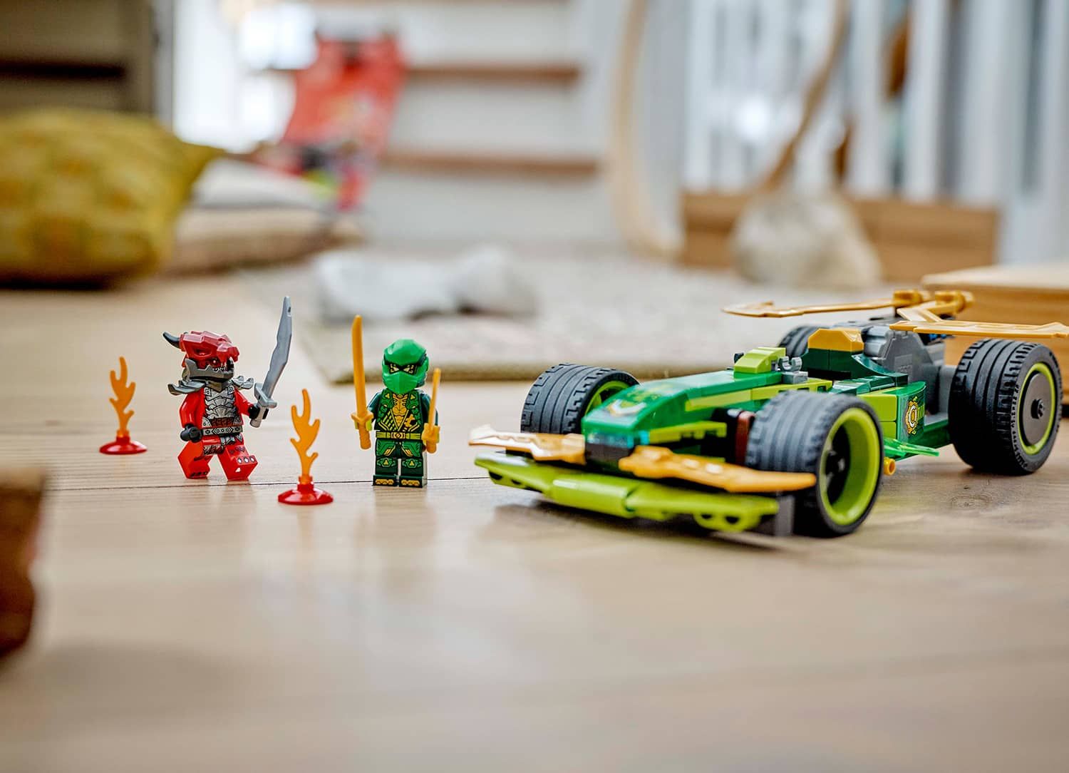 - Packed with features – The sleek race car toy has 4 tires and a cockpit and is decorated with green lightning blades. It also comes with 2 lighting elements to set up a small obstacle course