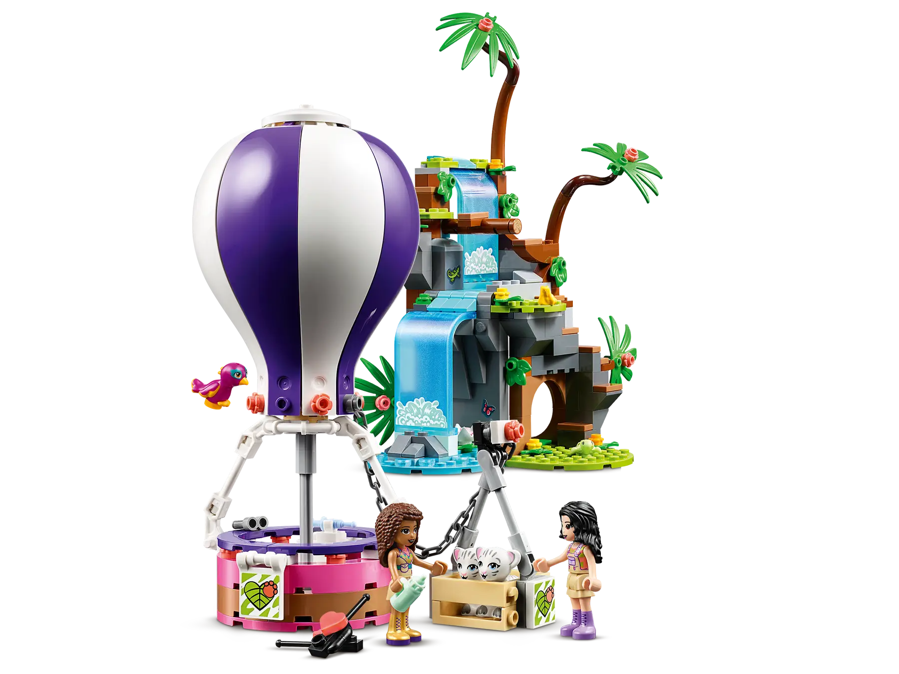Let children set sail on a LEGO® Friends adventure with the Tiger Hot Air Balloon Jungle Rescue (41423). Kids can pretend to take to the skies to rescue a toy tiger cub from a waterfall. This set comes with 2 tiger cubs, plus a toy parrot and baby turtle toy. LEGO Friends is proud to support the work of National Geographic Explorers.