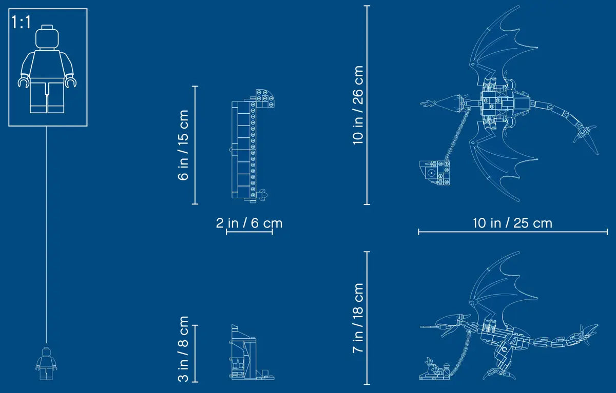 - Hungarian Horntail with wings open measures over 2” (7cm) high, 10” (27cm) long and 13” (34cm) wide.
