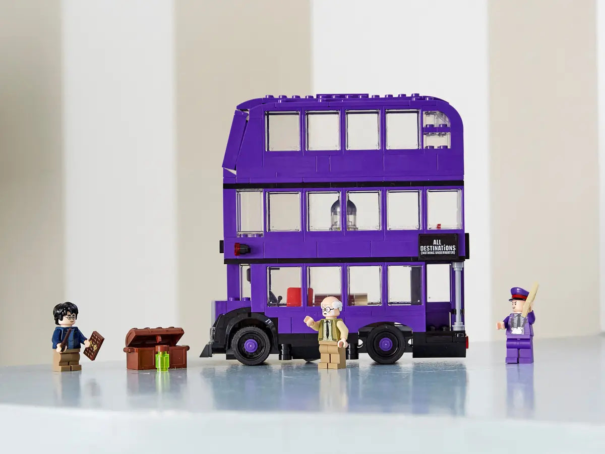 Give your young witch or wizard the ride of their life aboard the LEGO® Harry Potter™ 75957 Knight Bus™! When kids catch the purple triple-decker bus, they know they’re in for a wild ride. With a hinged side panel for easy access to the interior, and a removable roof to reveal the upper deck, this magical toy bus playset is bursting with play potential. Once Harry's trunk has been loaded, it's time to hold tight. As the vehicle races away, swerving around corners and bouncing over bumps, kids will love how the bed slides back and forth and the chandelier swings from the ceiling. Includes 3 minifigures.