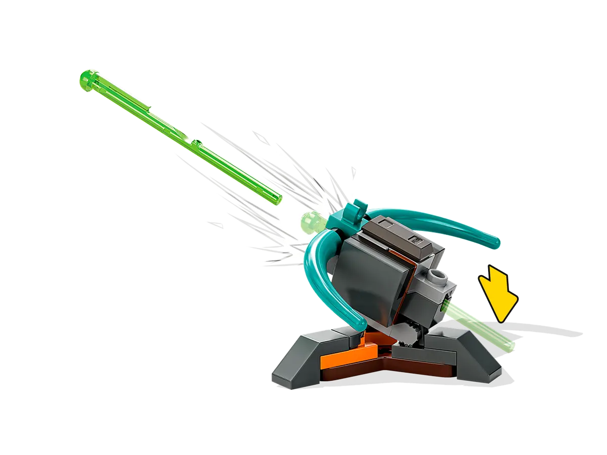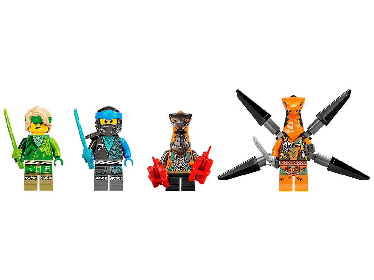 - 4 minifigures – Includes Lloyd with a sword, who can be upgraded with a hood; Nya with a sword; Viper Flyer with a jetpack and sword; and Python Dynamite with dynamite and a ballista shooter toy