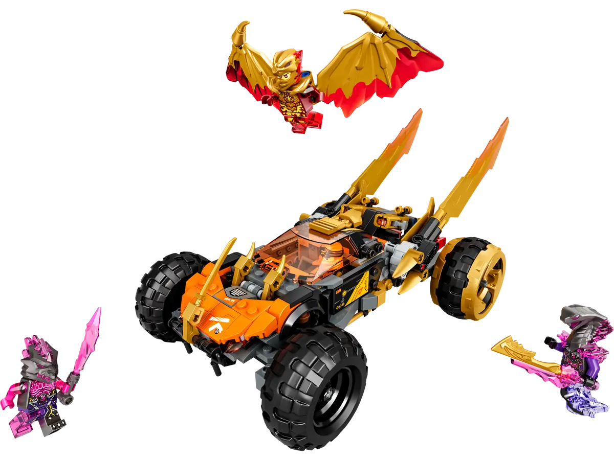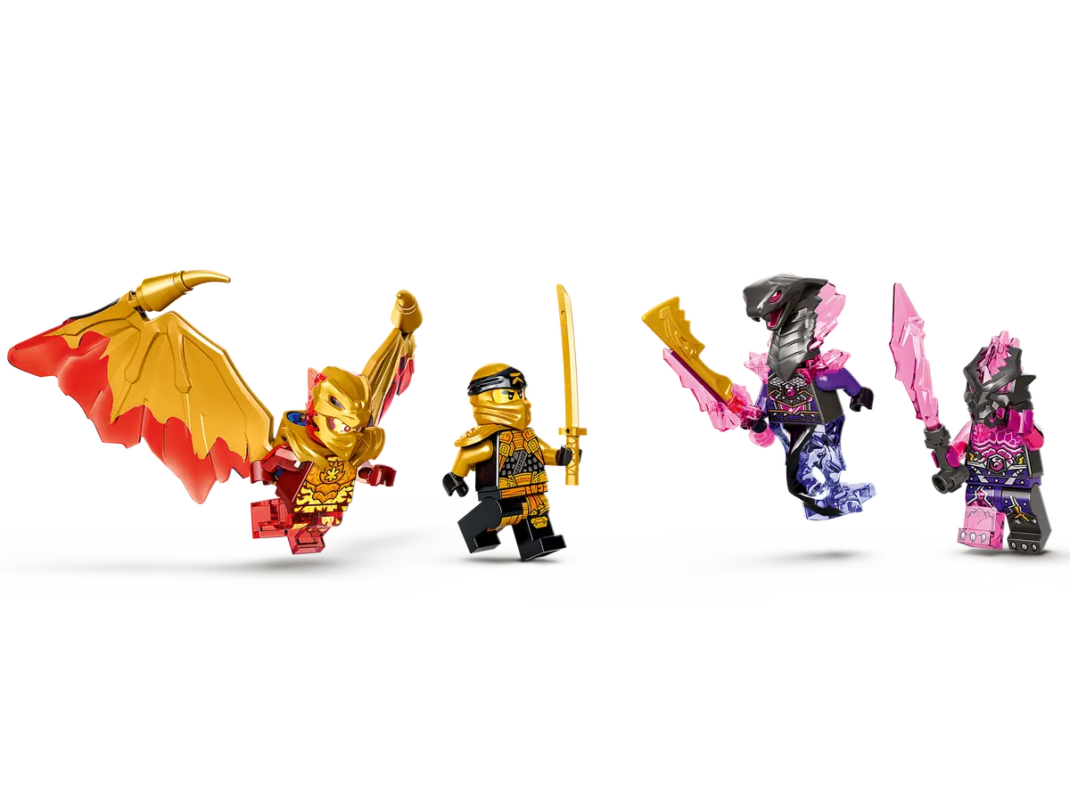 This NINJAGO vehicle building set includes 4 minifigures: Golden Dragon Kai, with his elementalweapon and a pair of golden dragon wings adorned with spikes; Golden Cole; the serpentine General Aspheera, armed with a crystal weapon; and Vengestone Brute with a sword.