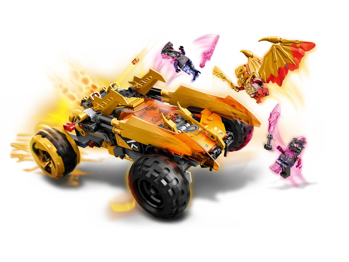 - NINJAGO® vehicle – The cruiser features 4 large tires, golden lightning blades that can be pushed forward into golden dragon attack mode, 2 stud shooters and a seat for minifigures