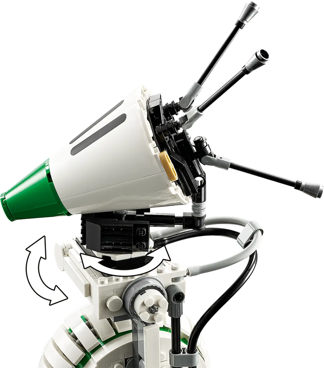 - The model has posable antennas and its head tilts and rotates 360 degrees just like the Star Wars™ character. It comes with a built-in display stand, plus an information sign and D-O minifigure to delight collectors.